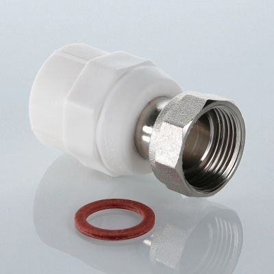 Прямой комбинированный фитинг (фитинг полипропиленовый) для соединения полипропиленовой трубы и компонента инженерной системы с резьбовым подключением. Монтаж осуществляется с помощью накидной гайки. Резьба – внутренняя трубная по ГОСТу 6357. Предусмотрен участок корпуса под гаечный или трубный рычажный ключ.