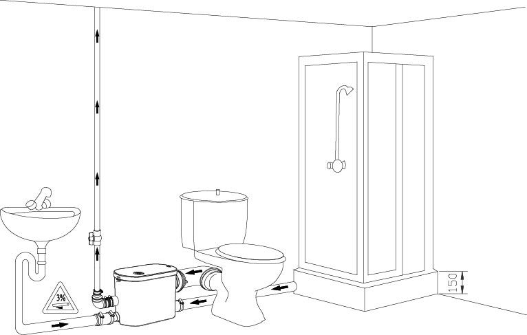 • унитаза, раковины, душа и подъема стоков на высоту до 8 метров;