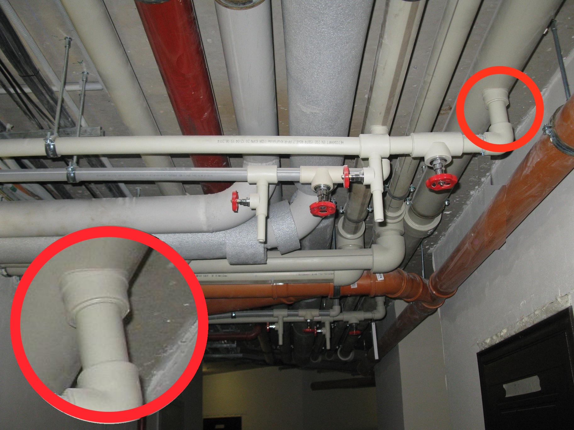 На приведенных ниже снимках пример комплексного решения реализованного на 17-и этажном жилом доме в г. Ивантеевке по ул. Студенческий пр-д, д 3. Укомплектованы системы ГВС и ХВС в техподполье (фото 1) , стояки (фото 2) и техчердак (фото 3) здания. Смонтированы и успешно эксплуатируются все типы выпускаемых заводом полипропиленовых труб диаметром от 20 мм до 110 мм.