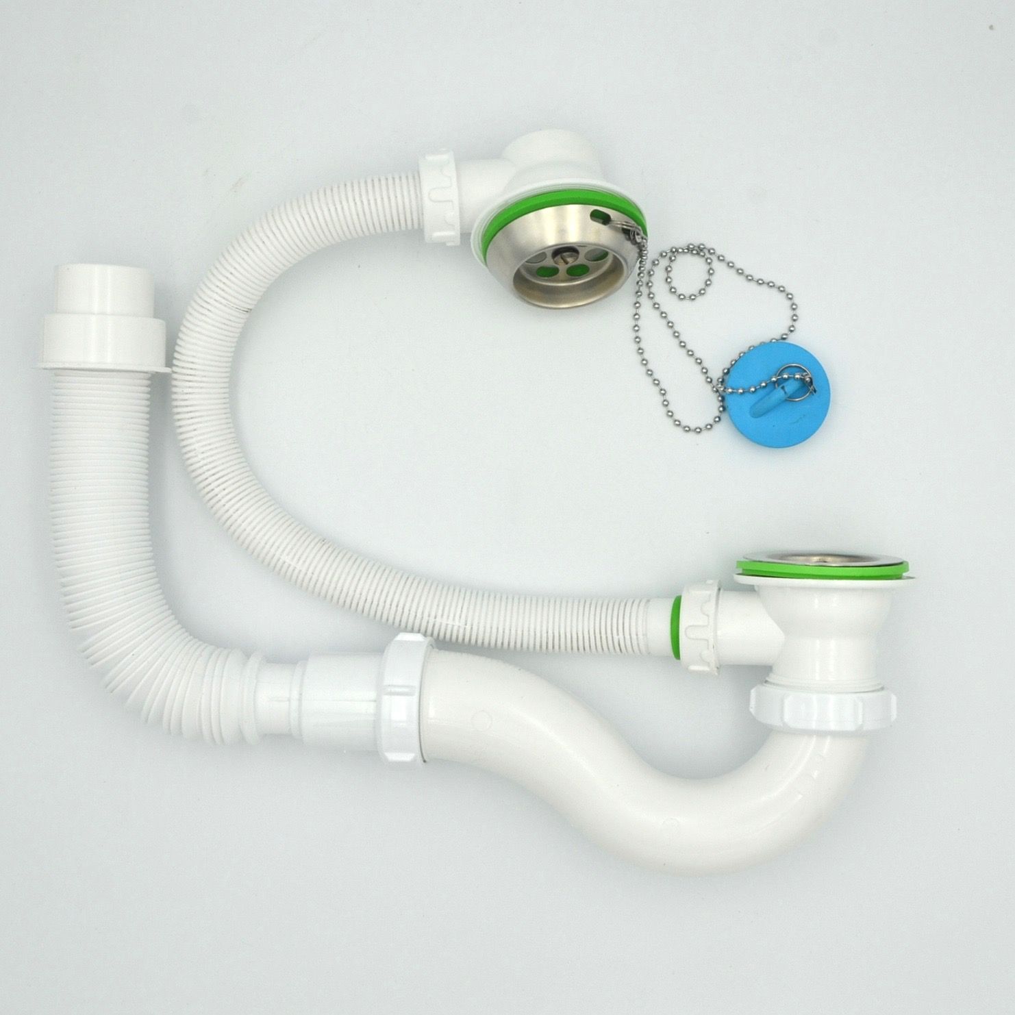 и применяется для слива использованной воды в канализационный сток. Сифон оснащен переливом. Диаметр слива 40 мм. В комплект входит универсальная гофрированная труба 40х40/50 мм длиной 365-800 мм и пробка с цепочкой.