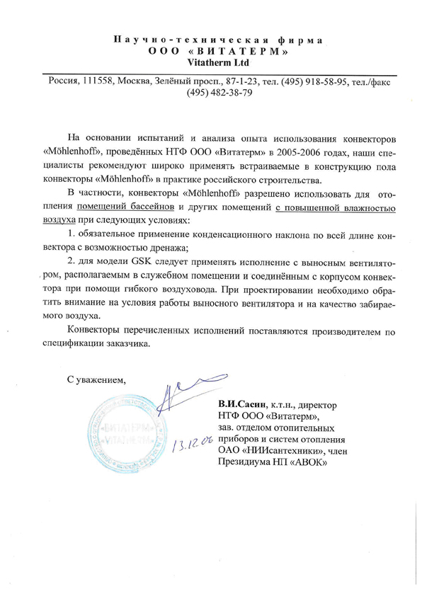 В 2005-2006 году были проведены испытания конвекторов «Möhlenhoff» в лаборатории НИИсантехники и получены «Рекомендации по применению» для проектировщиков. Также получено рекомендательное письмо к.т.н. Сасина В.И. о том, что на основании испытаний конвекторы «Möhlenhoff» рекомендуют устанавливать на любых объектах строительства в России в том числе в помещениях бассейнов.