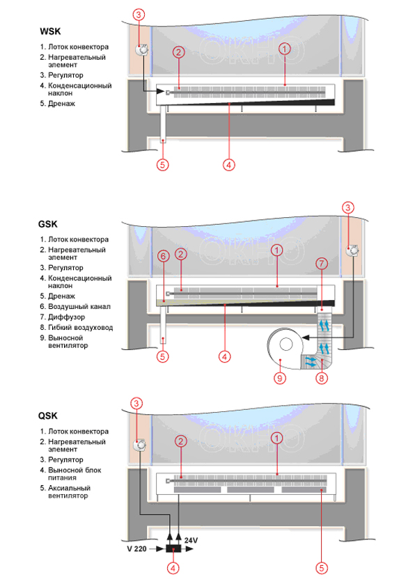 В конвекторах модели QSK (рис.3) вентиляторы не рассчитаны на полное затопление, следовательно их можно использовать только в отдалении от чаши бассейна (порядка 2 метров и более). Вентиляторы имеют специальное исполнение, препятствующее образованию на них налета от растворенного в воде и воздухе хлора. Конвекторы используются с выносным блоком и присоединительным модулем с трансформатором (box for connecting). Выносной блок  устанавливается во влагозащищенном месте.